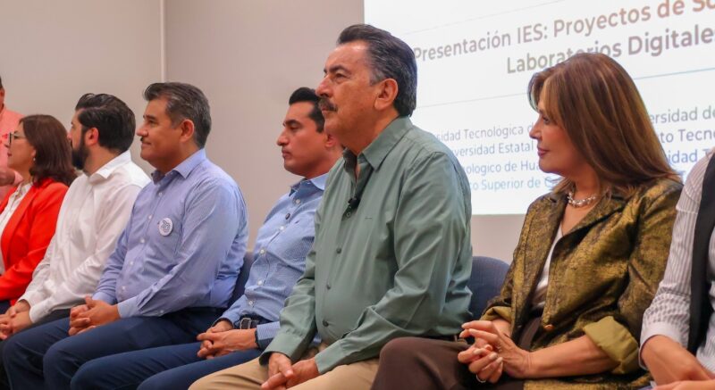 CIUDAD OBREGÓN, SONORA 6 DE OCTUBRE DE 2025.- Con el propósito de ser testigo de las habilidades tecnológicas aprendidas durante su formación profesional, el Presidente Municipal de Cajeme, Javier Lamarque, en compañía de su esposa y rectora de la Universidad Estatal de Sonora (UES), Patricia Patiño Fierro, del Secretario de Eduación, Froylán Gámez Gamboa y de Luis Javier Ortega Cisneros, Director de la Agencia de Transformación Digital y Telecomunicaciones, así como de las y los titulares de otras siete instituciones de educación superior, acudió a la presentación de Proyectos de Software de los Laboratorios Digitales desarrollados por ocho equipos de estudiantes universitarios.