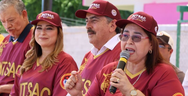 Posteriormente, realizó el lanzamiento de la primera bola junto a la Secretaria General del SUSTAC, Matilde Lemus Fierros.