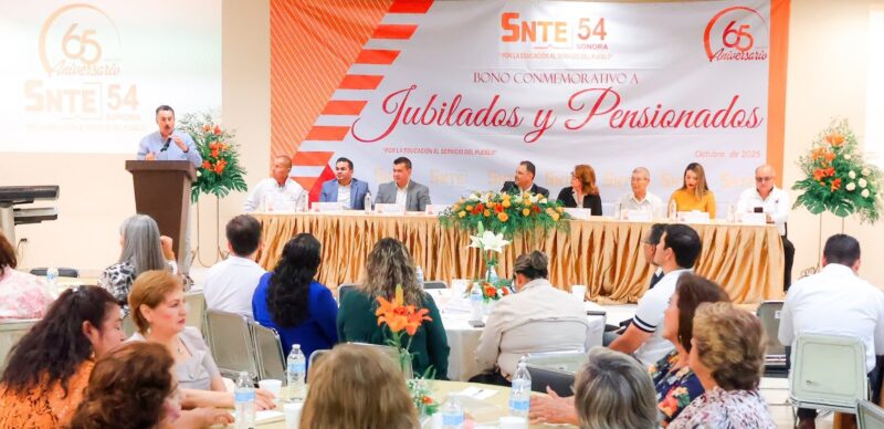 CIUDAD OBREGÓN, SONORA 22 DE OCTUBRE DE 2025.- Como un reconocimiento al esfuerzo, dedicación y compromiso de las y los maestros que durante años contribuyeron a la formación de generaciones sonorenses, el Presidente Municipal de Cajeme, Javier Lamarque, presidió la ceremonia de entrega del Bono Conmemorativo gestionado por la Sección 54 del SNTE, destinado a jubiladas, jubilados, pensionadas y pensionados de la Región Yaqui.