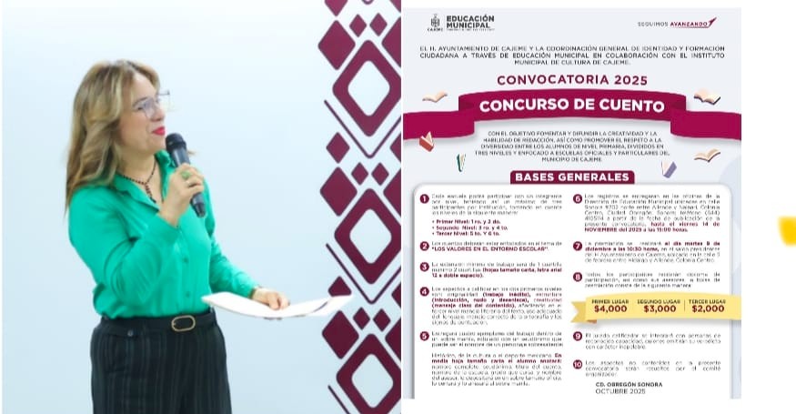 CIUDAD OBREGÓN, SONORA 30 DE OCTUBRE DE 2025.- Con el fin de fomentar y difundir la creatividad y la habilidad de redacción, así como promover el respeto a la diversidad entre alumnas y alumnos de nivel primaria, divididos en tres niveles y enfocado a escuelas públicas y privadas, el Gobierno Municipal y la Coordinación de Identidad y Formación Ciudadana, a través de Educación Municipal en colaboración con el Instituto Municipal de Cultura, convocan a participar en el Concurso de Cuento Infantil 2025.