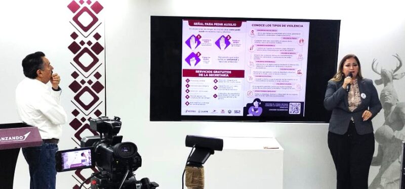 Herrera Ortiz, destacó que existe además existe una nueva Línea Mujeres 079, disponible a nivel nacional para brindar apoyo en situaciones de violencia, también explicó la señal universal de auxilio, que consiste en levantar la mano con la palma hacia afuera, doblar el pulgar hacia dentro y cerrar los dedos sobre él, para alertar sobre un posible riesgo.