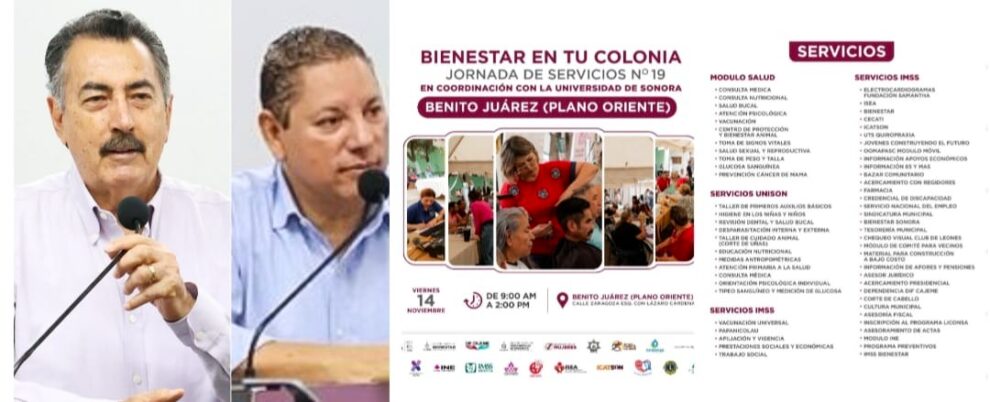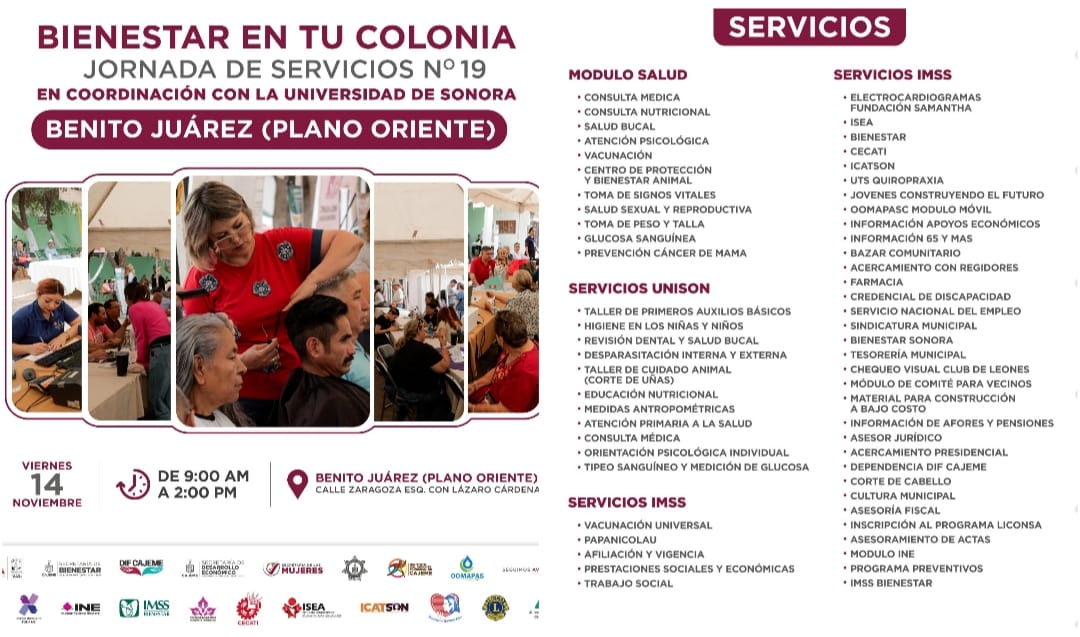 CIUDAD OBREGÓN SONORA 13 DE NOVIEMBRE DE 2025.- Con el fin de que la comunidad en general se beneficie con la variedad de trámites y servicios gratuitos que brinda la administración, en coordinación con la Secretaría del Bienestar y todas sus dependencias, así como participar en acciones para la reconstrucción del tejido social, a través de la convivencia pacífica y la prevención del delito, el Gobierno Municipal, invita a las familias de la colonia Benito Juárez y sus alrededores a que aprovechen los beneficios sociales de la Décimo Novena Jornada de Servicios.