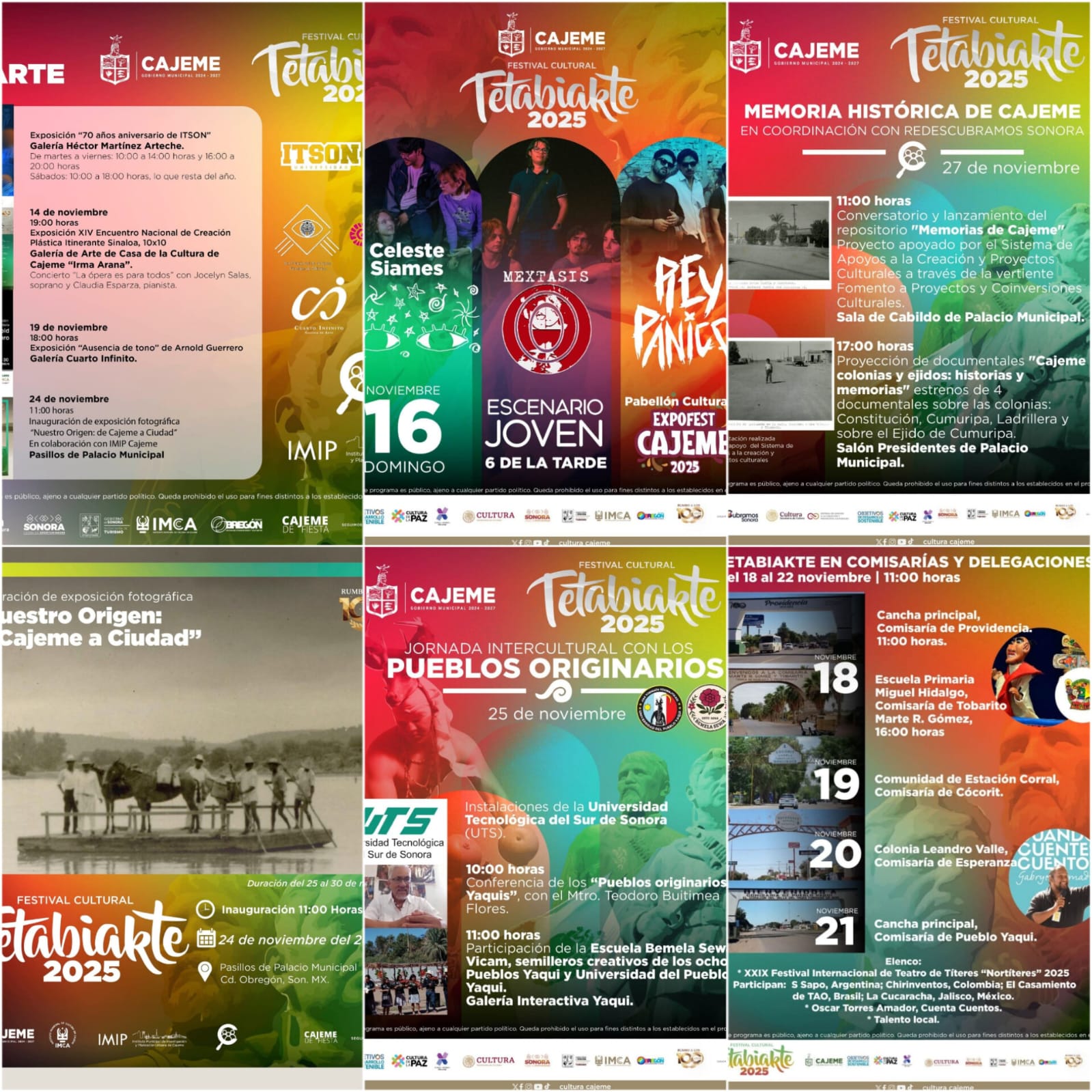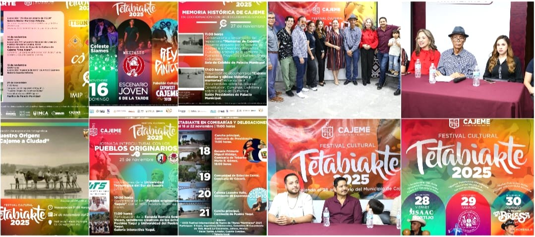 CIUDAD OBREGÓN SONORA 14 DE NOVIEMBRE DE 2025.- El Gobierno Municipal de Cajeme, a través del Instituto Municipal de Cultura de Cajeme (IMCCA), en colaboración con la Secretaría de Turismo Estatal, así como de otras instancias educativas, civiles, empresariales y culturales, ha preparado un amplio programa con motivo de la celebración del XXII Festival de Arte y Cultura Tetabiakte con el que se conmemorará el 98 aniversario de fundación del municipio, que en esta ocasión se realiza desde el 11 al 30 del presente mes, culminando con la entrega del reconocimiento a la Ciudadana y el Ciudadano Distinguido 2025.