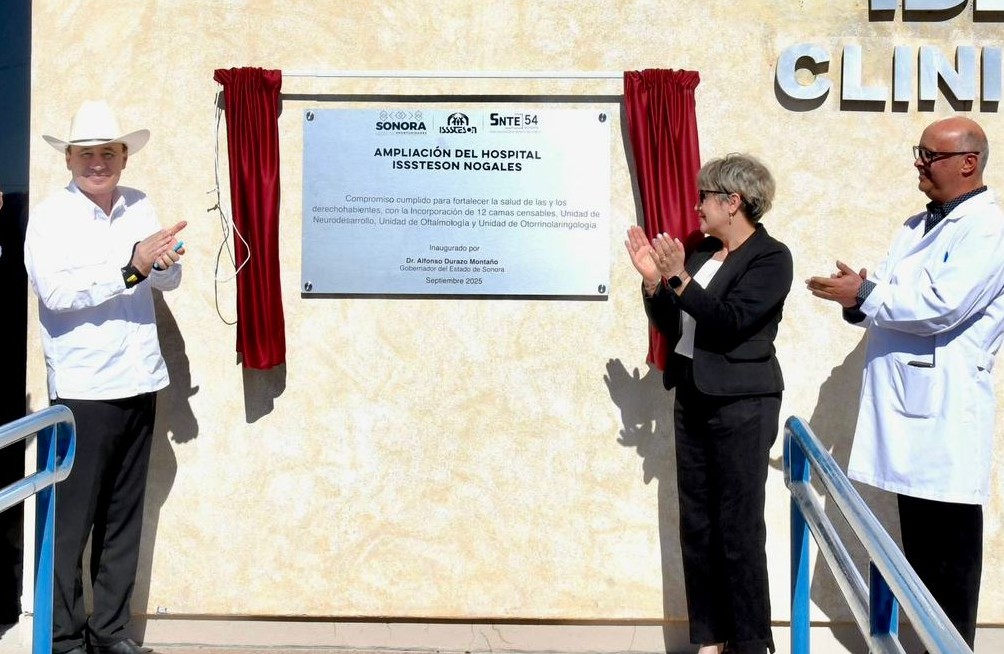 Nogales, Sonora; 14 de noviembre de 2025.- Con una inversión de más de un millón 500 mil pesos destinada a fortalecer la atención médica en el norte de la entidad, el gobernador Alfonso Durazo Montaño inauguró la ampliación del Hospital del Instituto de Seguridad y Servicios Sociales de los Trabajadores del Estado de Sonora (Isssteson) en Nogales, una obra que brinda beneficios inmediatos a 31 mil derechohabientes, entre ellos trabajadores, jubilados y a sus familias, al aumentar la capacidad hospitalaria e incorporar nuevas áreas especializadas.