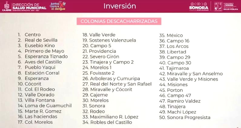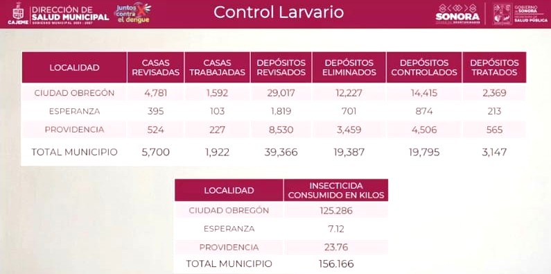 El Presidente de Cajeme, Javier Lamarque Cano, junto al Director de Salud Municipal, Jesús María Espinoza Castillo, destacaron que la prevención de estas enfermedades es primordial ya que, de no prevenir su propagación, en casos extremos pueden ser mortales, razón por la que han incrementado las acciones de control larvario, descacharre y fumigación en 50 colonias y comunidades rurales del municipio.