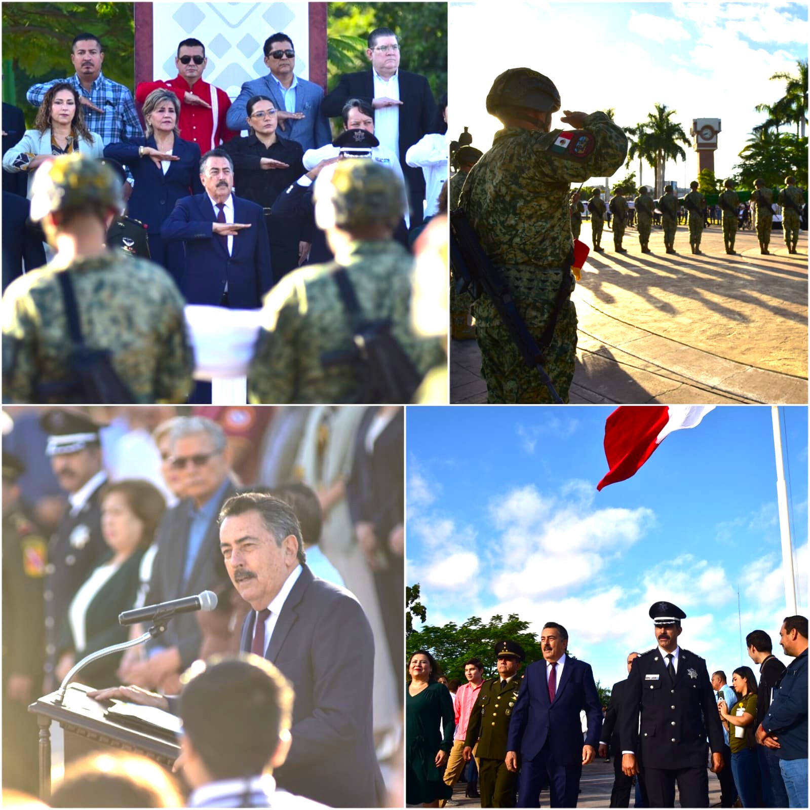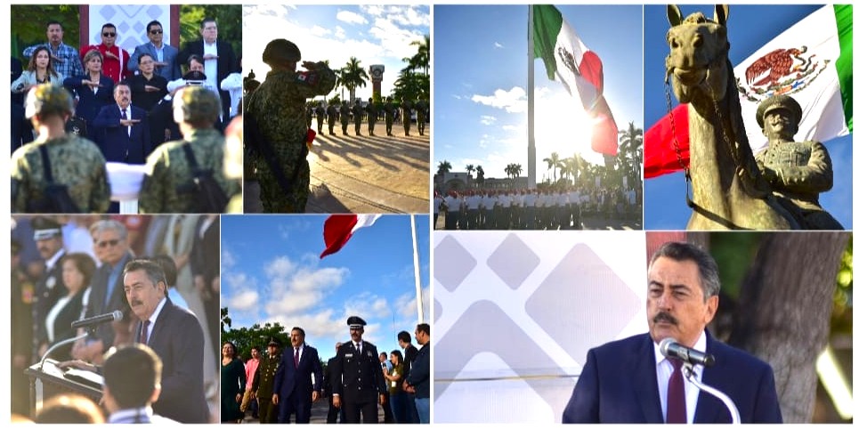 CIUDAD OBREGÓN, SONORA 20 DE NOVIEMBRE DE 2025.- “La Revolución Mexicana es uno de los hechos más importantes de la historia de la nación, en la que desatacaron Francisco I. Madero, Emiliano Zapata, Francisco Villa y Venustiano Carranza como líderes que impulsaron el idealismo democrático, las demandas agrarias y justicia social y la voluntad legal e institucional para la construcción del Estado mexicano tal como lo conocemos hoy, además de la promulgación de Constitución Política de 1917, que estableció las bases legales para los derechos laborales, la reforma agraria y la educación pública”, manifestó el Alcalde Javier Lamarque al presidir la ceremonia cívica de Izamiento de Bandera para conmemorar el 115 aniversario del inicio de la Revolución Mexicana.