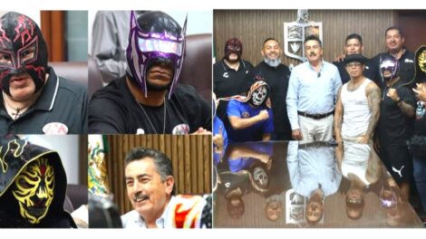 CIUDAD OBREGÓN, SONORA 28 DE ABRIL DE 2025.- Previo a su participación en la función de lucha que sostuvieron en las instalaciones del Centro de Usos...